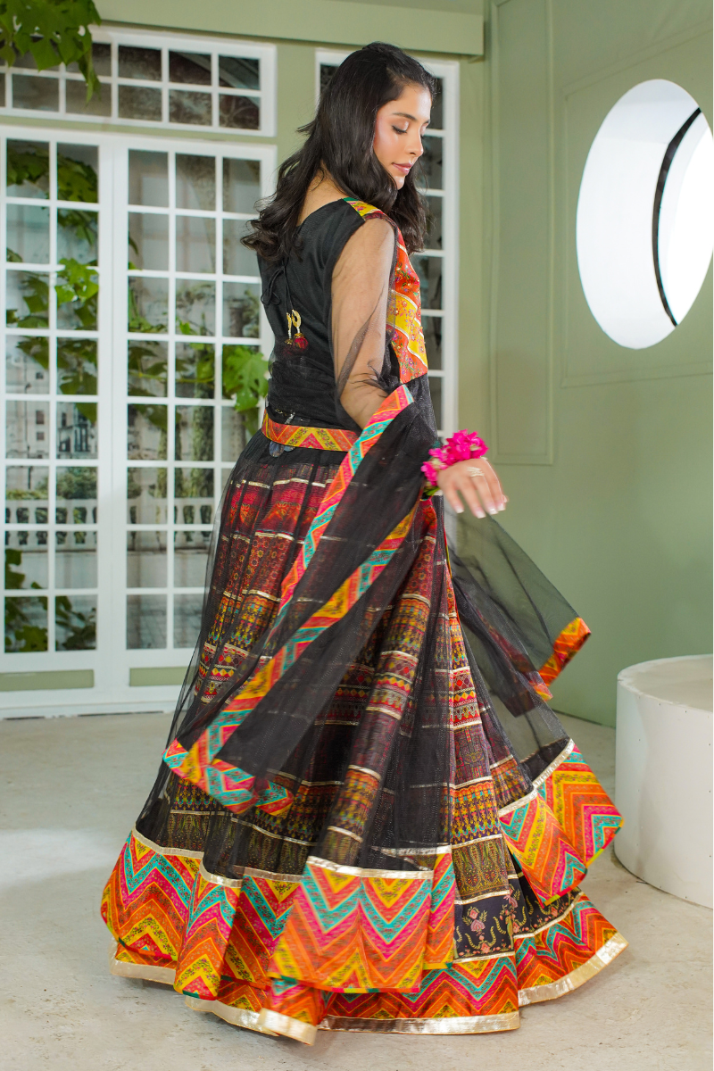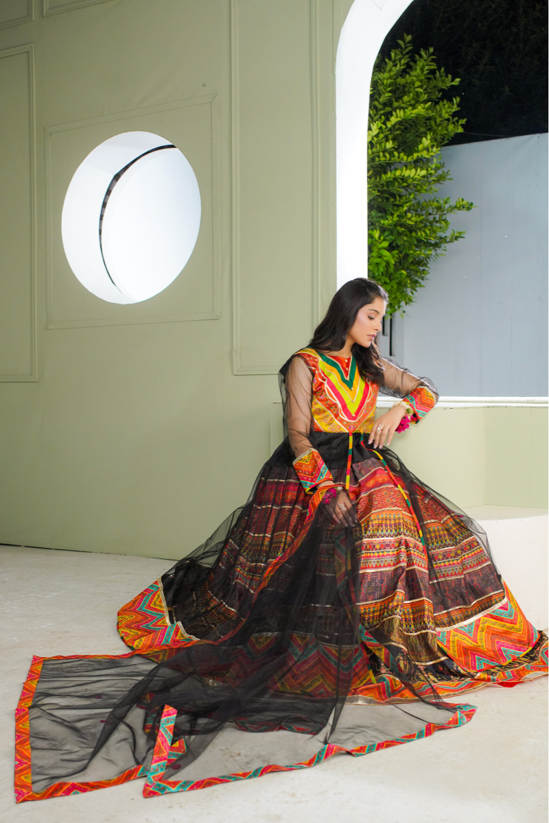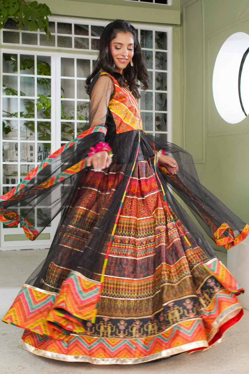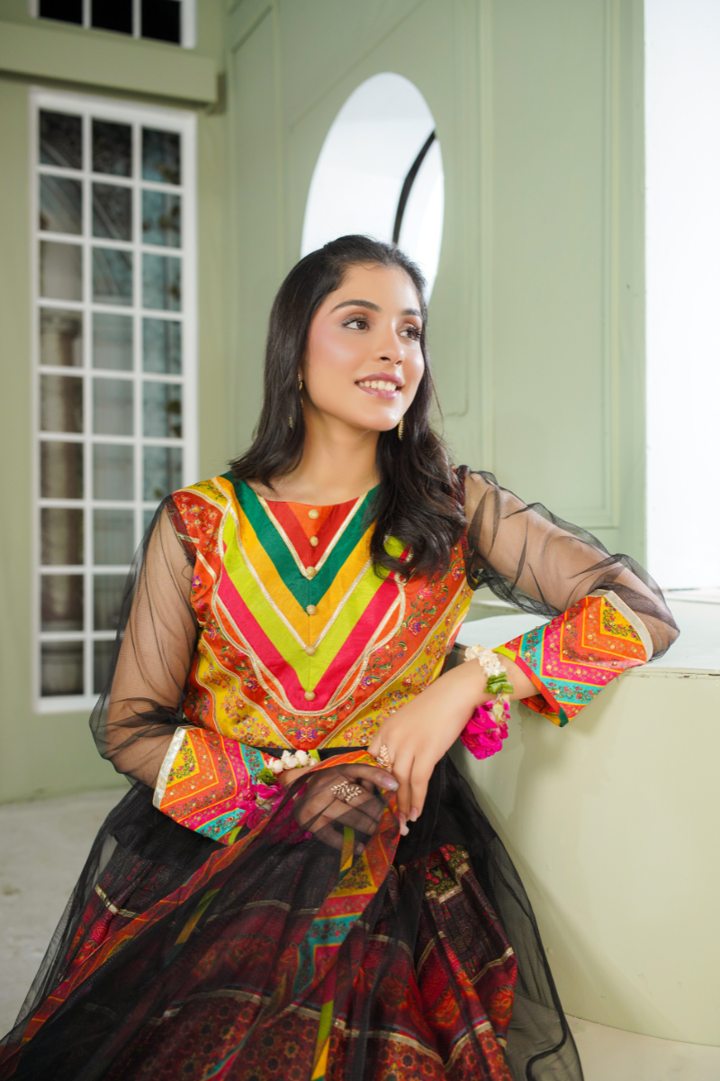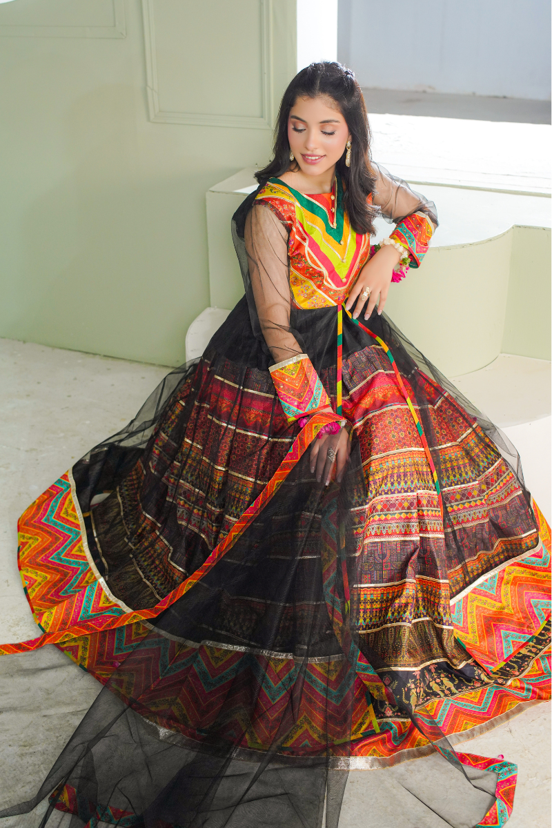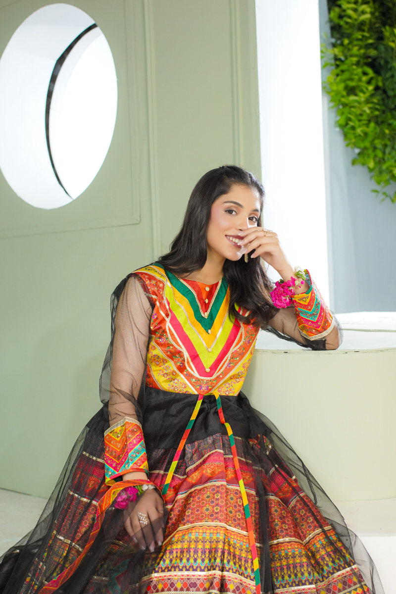 Long frock in net & silk neckline embellished with silk printed lengha , long net frock with printed border and hand work at neckline multi color printed lengha